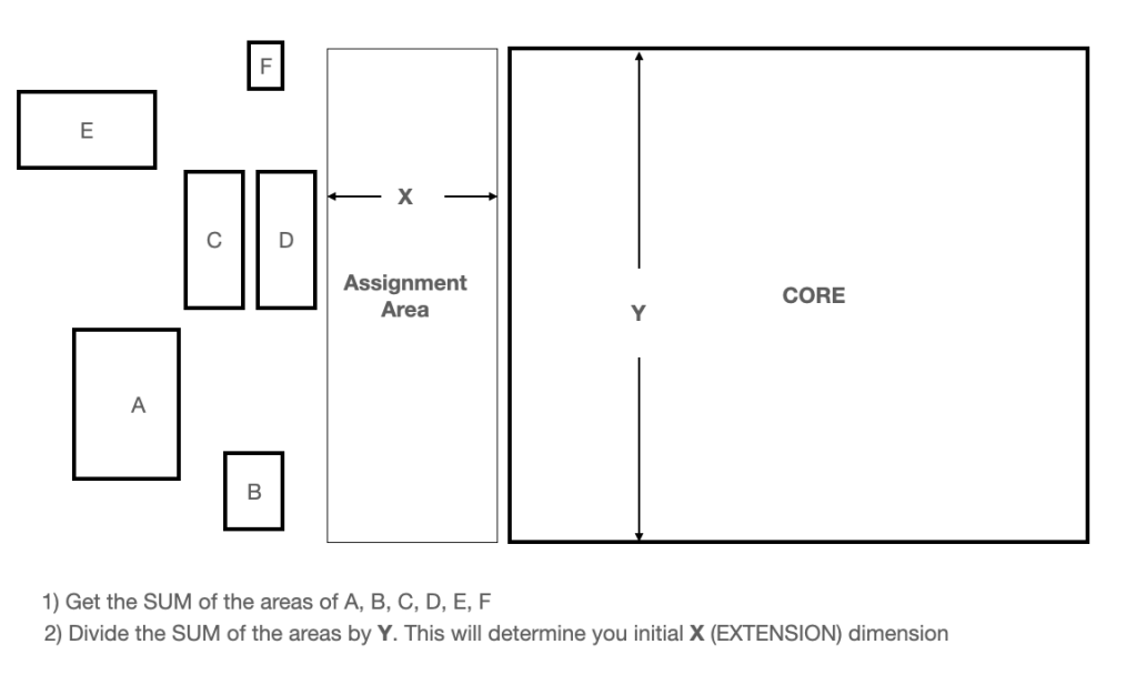 - Divide the Total Area by the dimension of the array/core (or whatever measurement is the defining the limit for your assigned area). This quotient will give you an EXTENSION dimension from the array. For now, let’s call the Extension “X”.