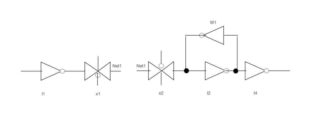 In a random logic circuit, you often see several latches and input of each latch (i2/w1) is preceded by an XFR gate (x2). In general, you want to keep this latch together with the XFR since the XFR is not designed to drive and the “memory” node (x2 to w2 junction) of a latch is subject to undesired flipping from net noise if the net is too exposed (i.e. too long or too adversely noise coupled).